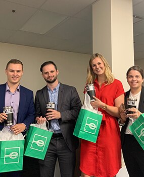 Group of employees with gift bags and travel mugs